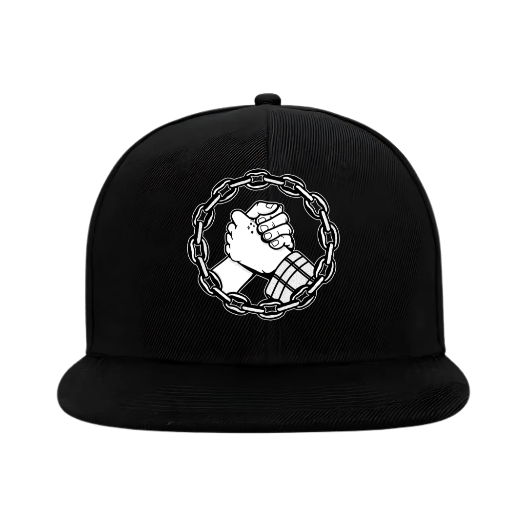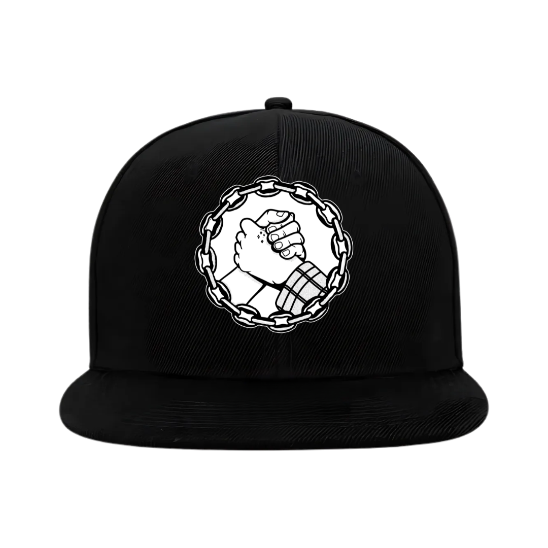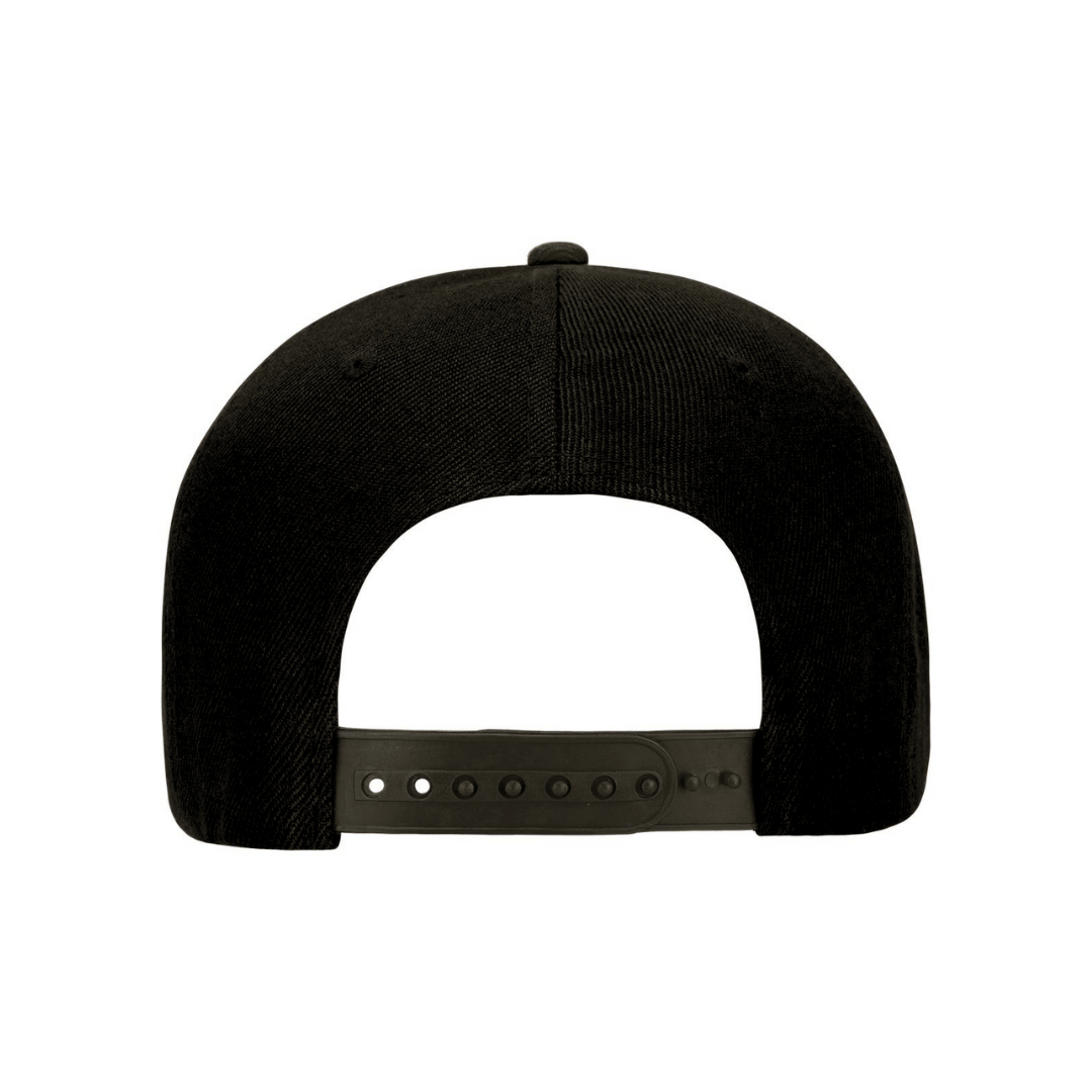 Our snapback hat features Premium American Twill fabric with a flat peak and foil sticker. Structured 6 panel design, plastic snapback fastener and padded cotton sweatband. Available in Black with a Black or White embroidery logo patch.